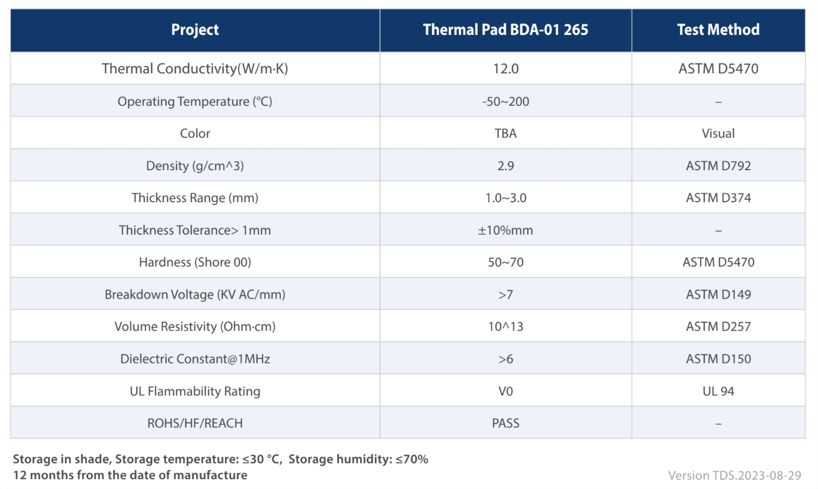 BDA -01265 thermal pad conductive silicone sheet is used to fill the interface of two objects, so that the air from the interface is discharged and the thermal conductivity is improved. The product has self-adhesive, can be die-cut into a variety of shapes, easy assembly. The thermal conductivity is 12.0 W/m. K