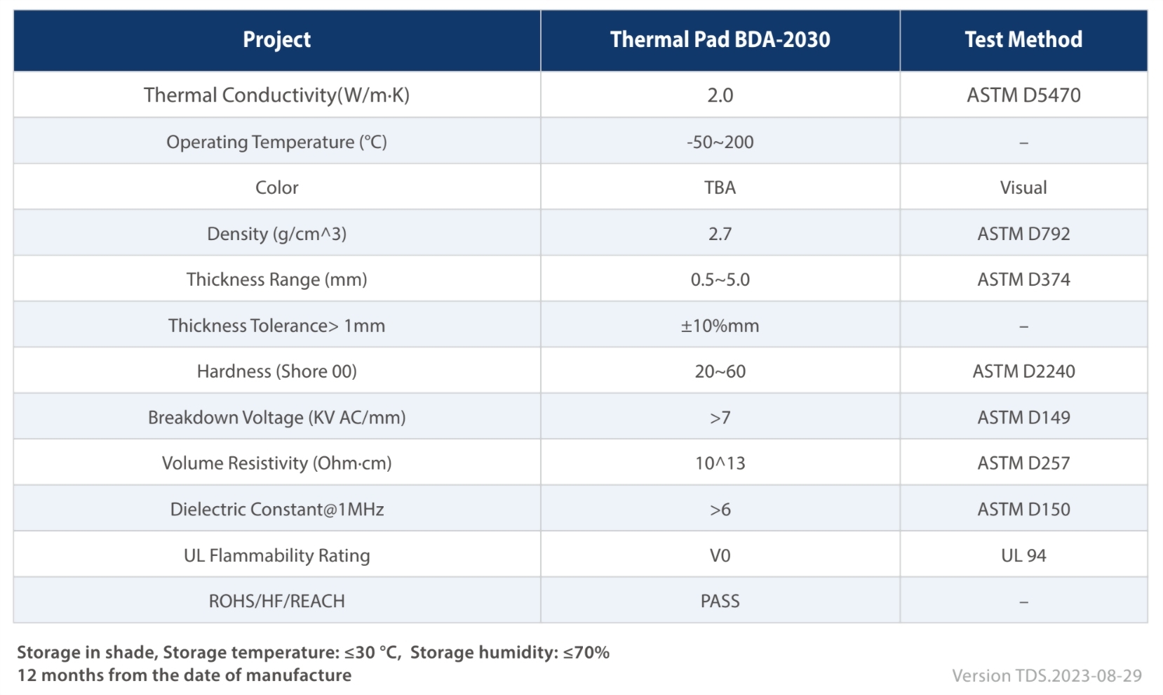 BDA -2030 thermal pad conductive silicone sheet is used to fill the interface of two objects, so that the air from the interface is discharged and the thermal conductivity is improved. The product has self-adhesive, can be die-cut into a variety of shapes, easy assembly. The thermal conductivity is 2.0 W/m. K