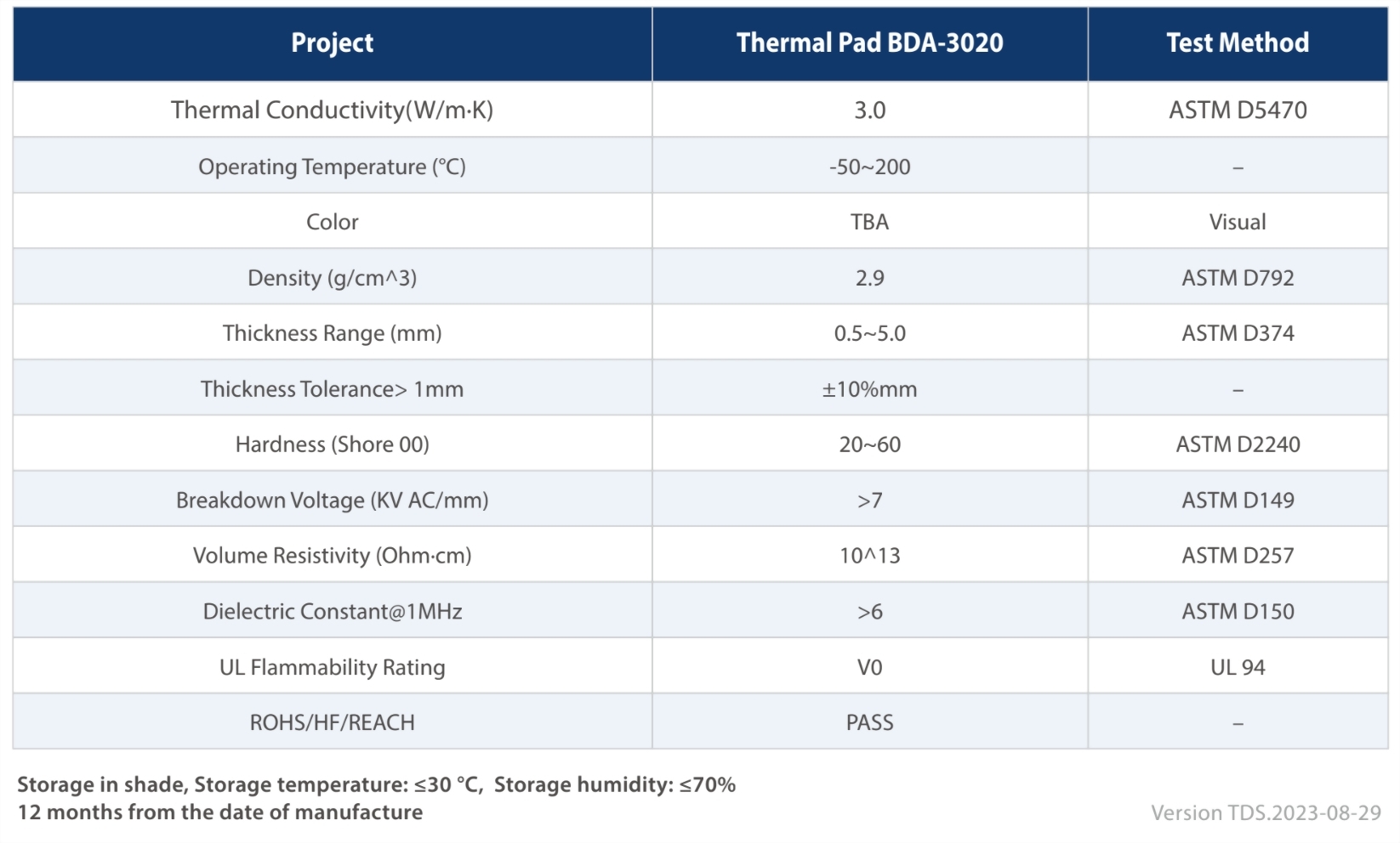 BDA -3020 thermal pad conductive silicone sheet is used to fill the interface of two objects, so that the air from the interface is discharged and the thermal conductivity is improved. The product has self-adhesive, can be die-cut into a variety of shapes, easy assembly. The thermal conductivity is 3.0 W/m. K