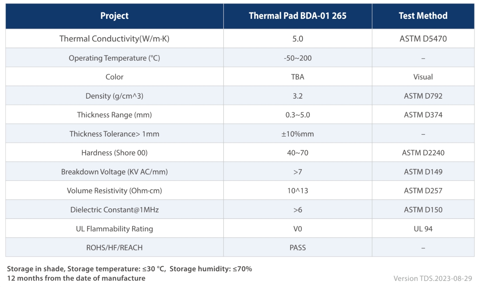 BDA -5040 thermal pad conductive silicone sheet is used to fill the interface of two objects, so that the air from the interface is discharged and the thermal conductivity is improved. The product has self-adhesive, can be die-cut into a variety of shapes, easy assembly. The thermal conductivity is 5.0 W/m. K
