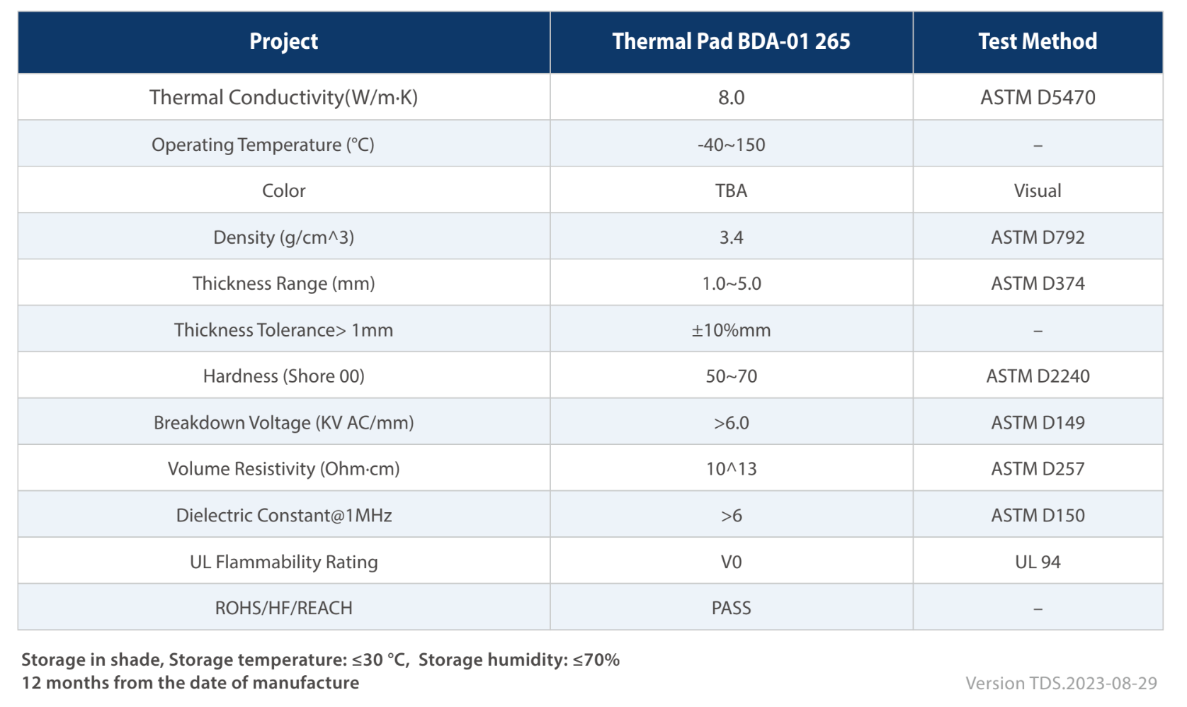 BDA -8060 The utility model belongs to a high-performance silicone thermal conductive silicone sheet, which is made of silica gel as a matrix and filled with various high-performance ceramic powders. The utility model has the advantages of low hardness, high thermal conductivity, low thermal resistance, good adhesion on the heat dissipation parts, low insulation and compression stress, etc.
