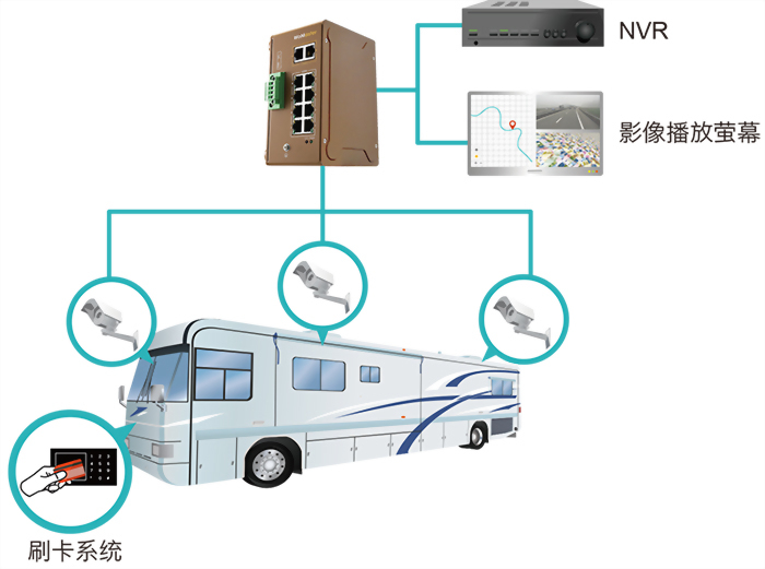 車載的NVR(網絡硬盤錄像機)系統記錄了來自PoE視頻攝像機的信號,這些PoE攝像機安裝於駕駛室、公交車內各部,並可通過儀表板上的LCD顯示屏,隨時觀看錄製的視頻。