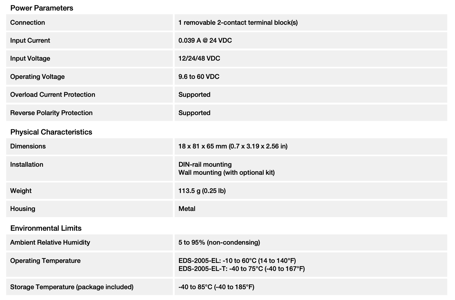 The EDS-2005-EL Series has a 12/24/48 VDC single power input, DIN-rail mounting, and high-level EMI/EMC capabilities. In addition to its compact size, the EDS-2005-EL Series has passed a 100% burn-in test to ensure it will function reliably after it has been deployed. The EDS-2005-EL Series has a standard operating temperature range of -10 to 60°C with wide-temperature (-40 to 75°C) models also available.