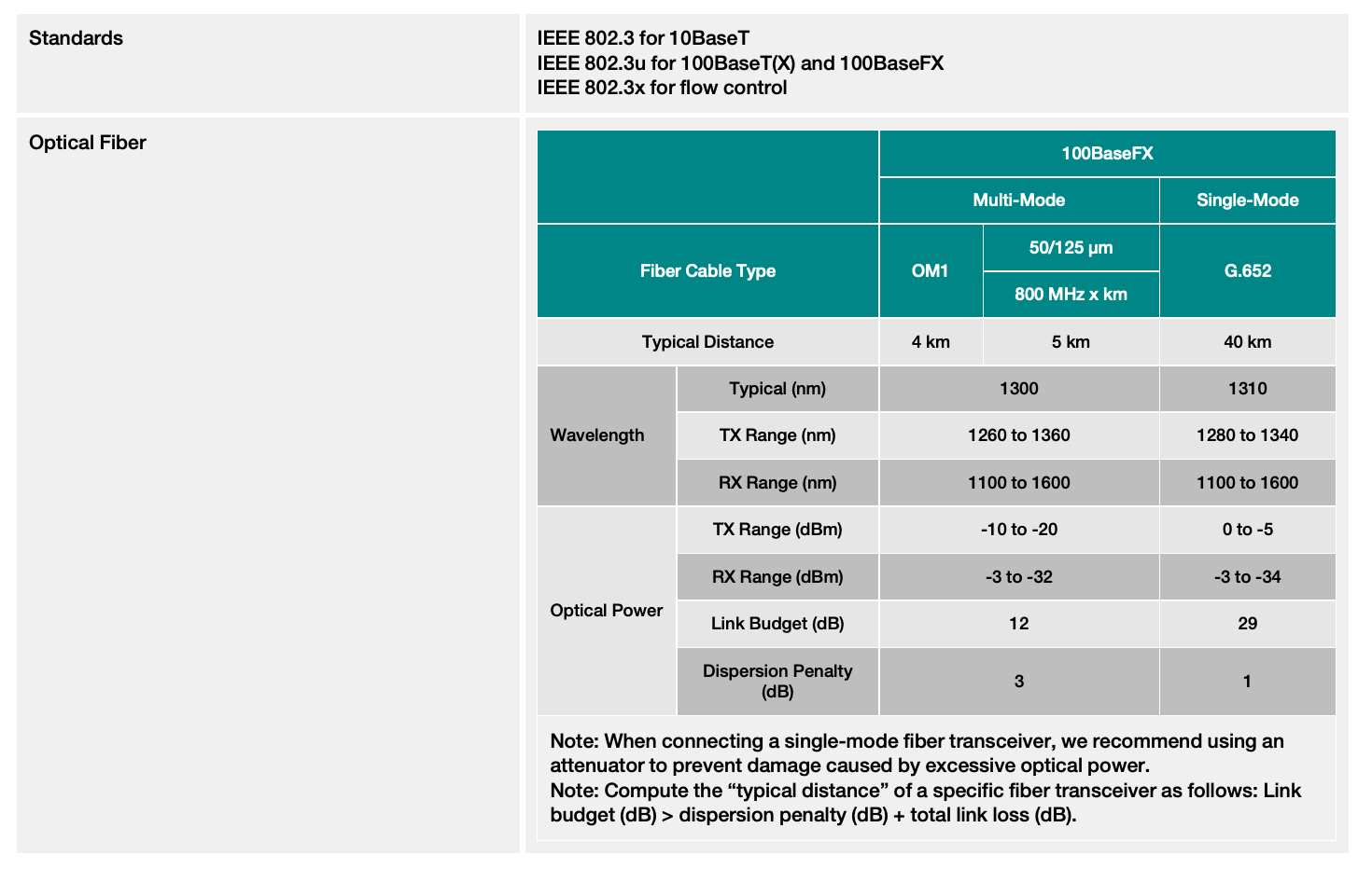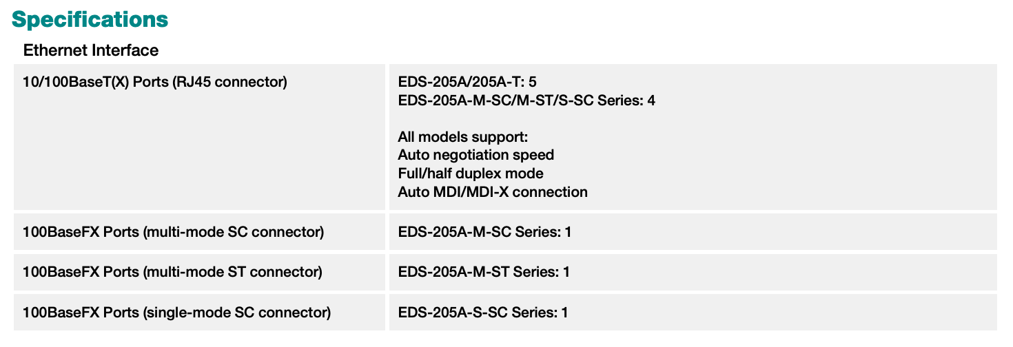 - 10/100BaseT(X) (RJ45 connector), 100BaseFX (multi/single-mode, SC or ST connector)