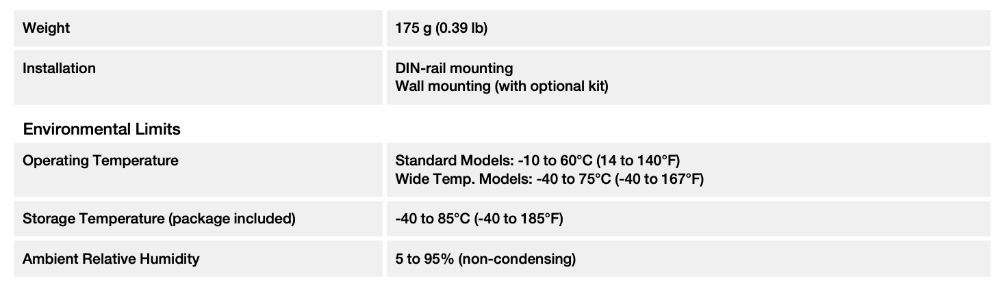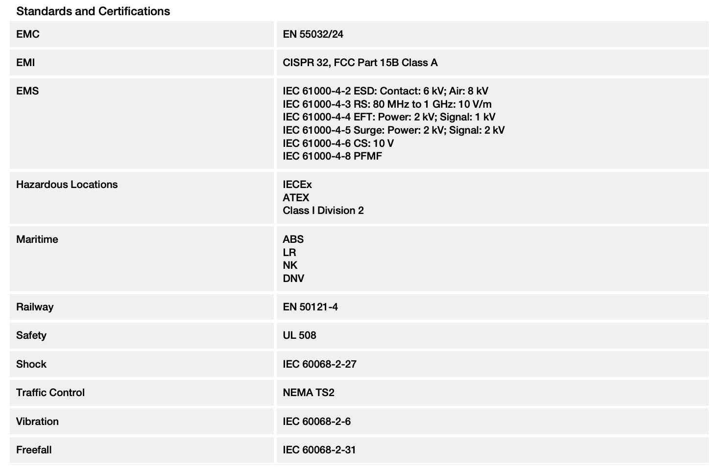 - Rugged hardware design well suited for hazardous locations (Class 1 Div. 2/ATEX Zone 2), transportation (NEMA TS2/EN 50121-4), and maritime environments (DNV/LR/ABS/NK)