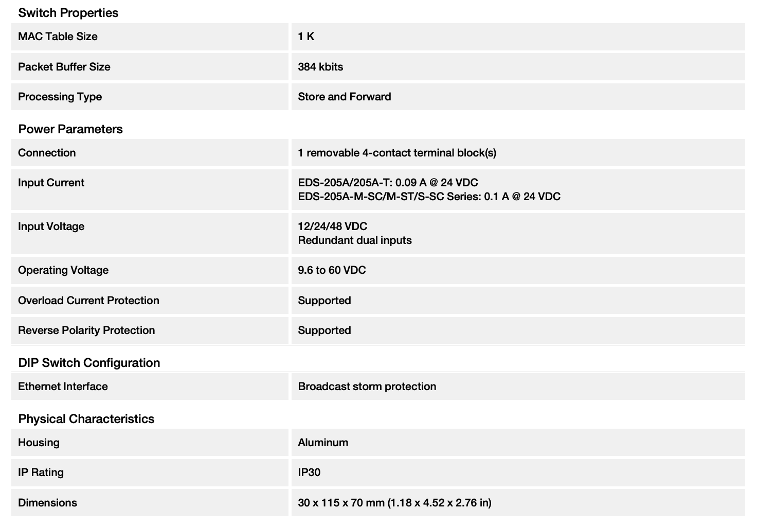 The EDS-205A Series 5-port industrial Ethernet switches support IEEE 802.3 and IEEE 802.3u/x with 10/100M full/half-duplex, MDI/MDI-X auto-sensing. The EDS-205A Series has 12/24/48 VDC (9.6 to 60 VDC) redundant power inputs that can be connected simultaneously to live DC power sources. These switches have been designed for harsh industrial environments, such as in maritime (DNV/LR/ABS/NK), rail wayside, highway, or mobile applications (EN 50121-4/NEMA TS2/e-Mark), or hazardous locations (Class I Div. 2, ATEX Zone 2) that comply with FCC, UL, and CE standards.