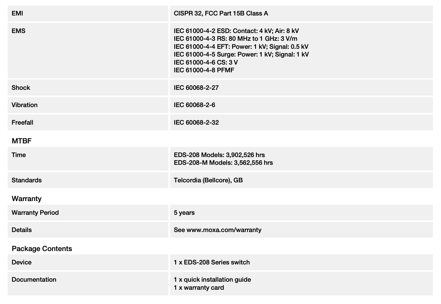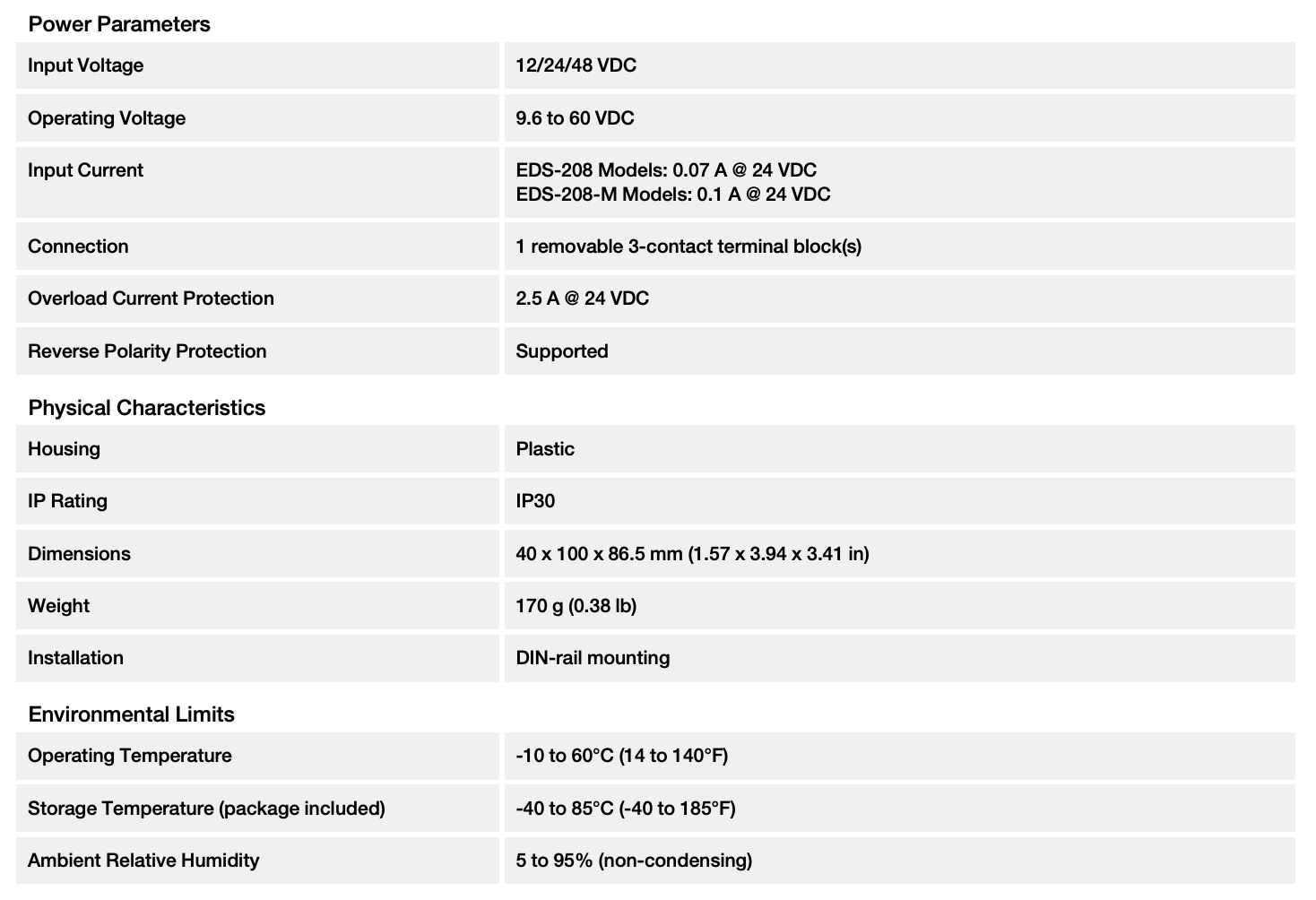 The EDS-208 Series supports IEEE 802.3/802.3u/802.3x with 10/100M, full/half-duplex, MDI/MDIX auto-sensing RJ45 ports. The EDS-208 Series is rated to operate at temperatures ranging from -10 to 60°C, and is rugged enough for any harsh industrial environment. The switches can be easily installed on a DIN rail as well as in distribution boxes. The DIN-rail mounting capability, wide operating temperature capability, and the IP30 housing with LED indicators make the plug-and-play EDS-208 switches easy to use and reliable.