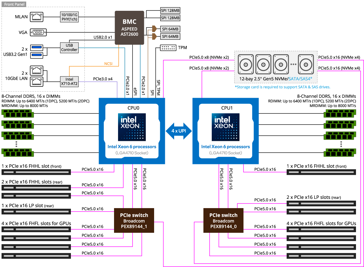 - 12 x 2.5" Gen5 NVMe/SATA/SAS-4 hot-swap bays