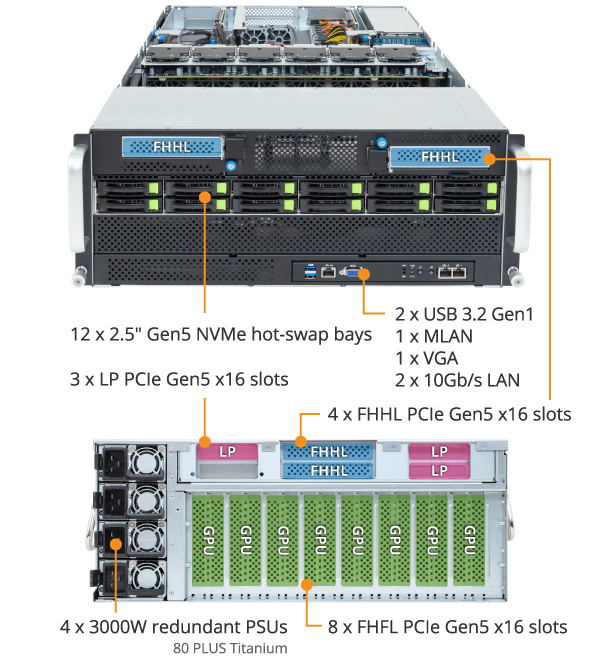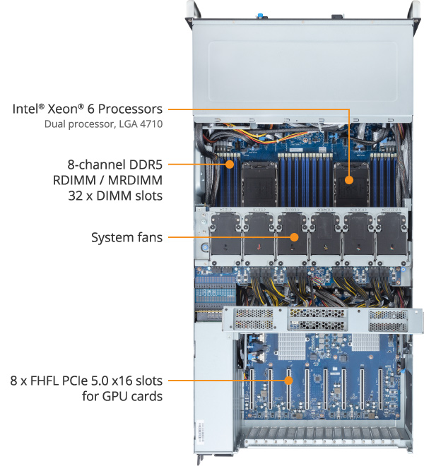 - 8 x FHFL PCIe Gen5 x16 slots for GPUs